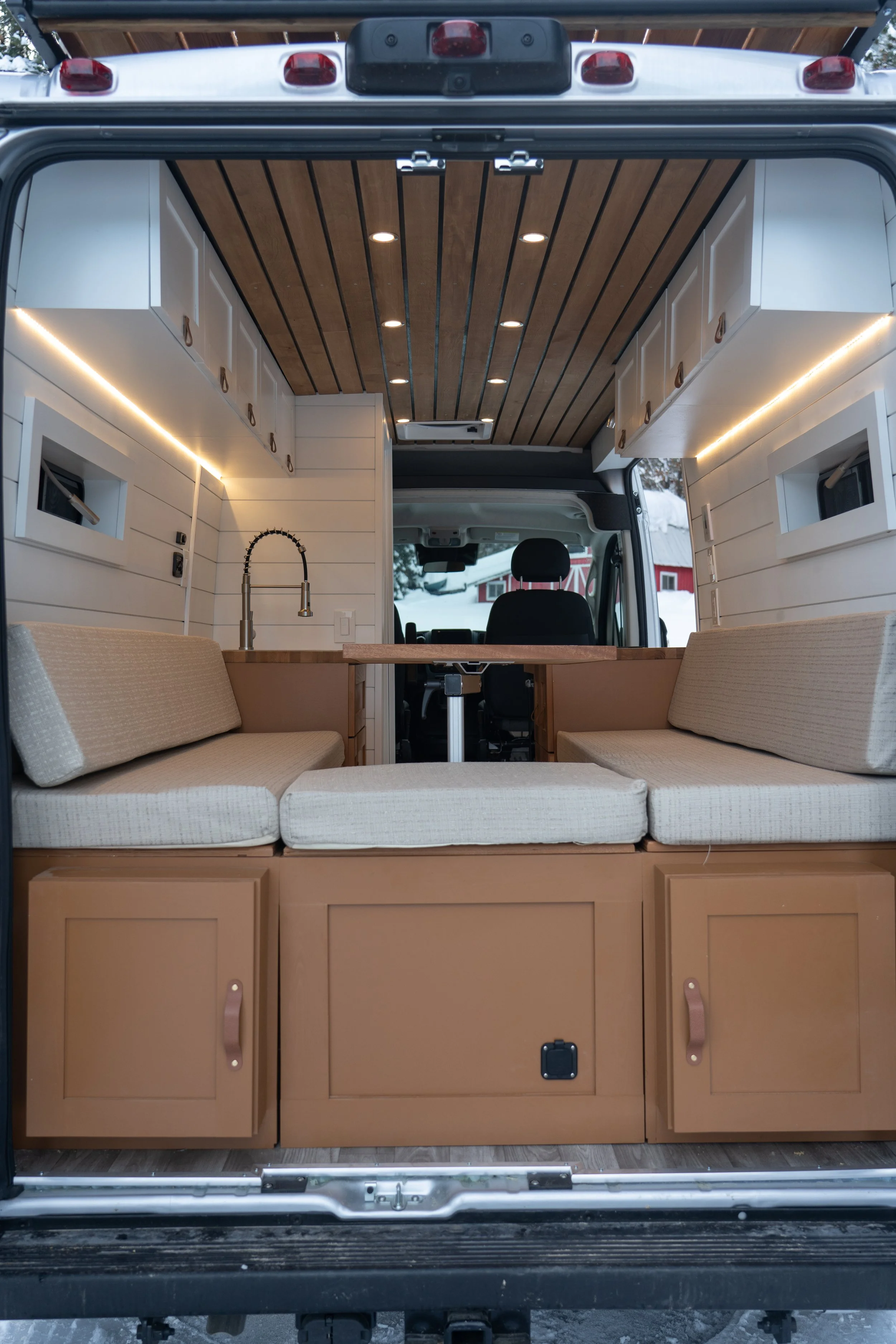 We are so excited to share our newest build, The Birch, our most livable build. After weeks of trying to find a new Promaster we were so excited to pick this one up from our local Ram dealer. This van came from the lot to our shop. This build is designed to live in, no matter the elements. With a powerful Esbar heater, that runs off gasoline you’ll have endless hot water and hot air. Perfect for when you’re using your indoor or outdoor shower. A custom geometric table, dark slated ceiling, and Sunbrella fabric rounds out a chic yet homey aesthetic.