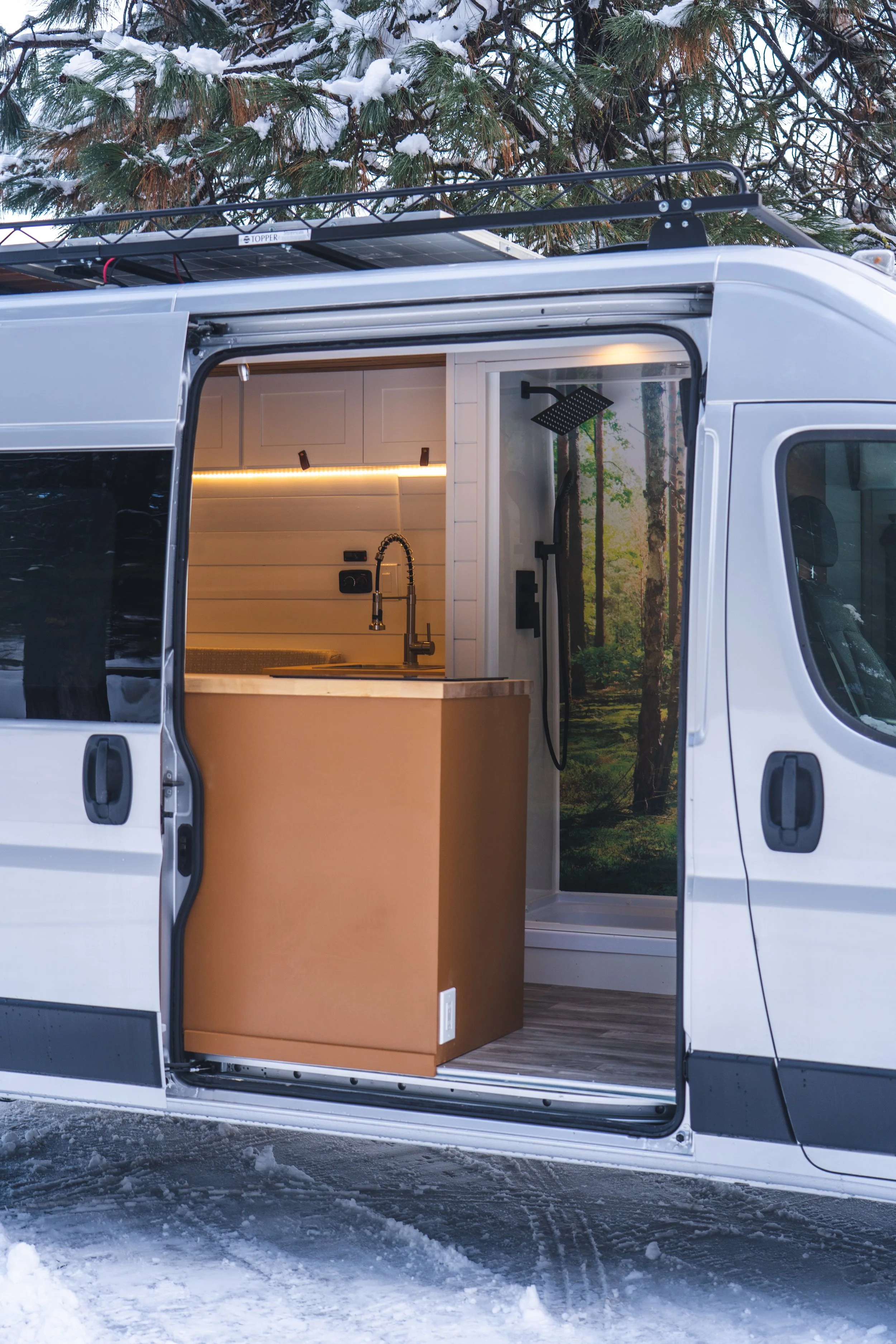 Birch was designed with long term livability in mind. A spacious interior is able to cater to a couple that wants to work or stay on the road for weeks or months on end. The large indoor shower has endless hot water thanks to the Esbar gasoline heater. Simply press the heater on and enjoy a warm and toasty interior while you work or cook. A large U-shaped bench, lagun table, custom geometric table, and Sunbrella fabric all create a warm and welcoming vibe in the back of the van. While the kitchen area has ample storage, a large stainless steel sink, and two burner induction cooktop. The large Made in Italy fridge is the fridge that I have in my personal van. After 6 years it hasn’t let me down once, even creating ice cubes during June in Utah with no problems. The grey water has a push to release ball valve, meaning no need to struggle under the van or get messy. Simply press a button and you’re good to roll.