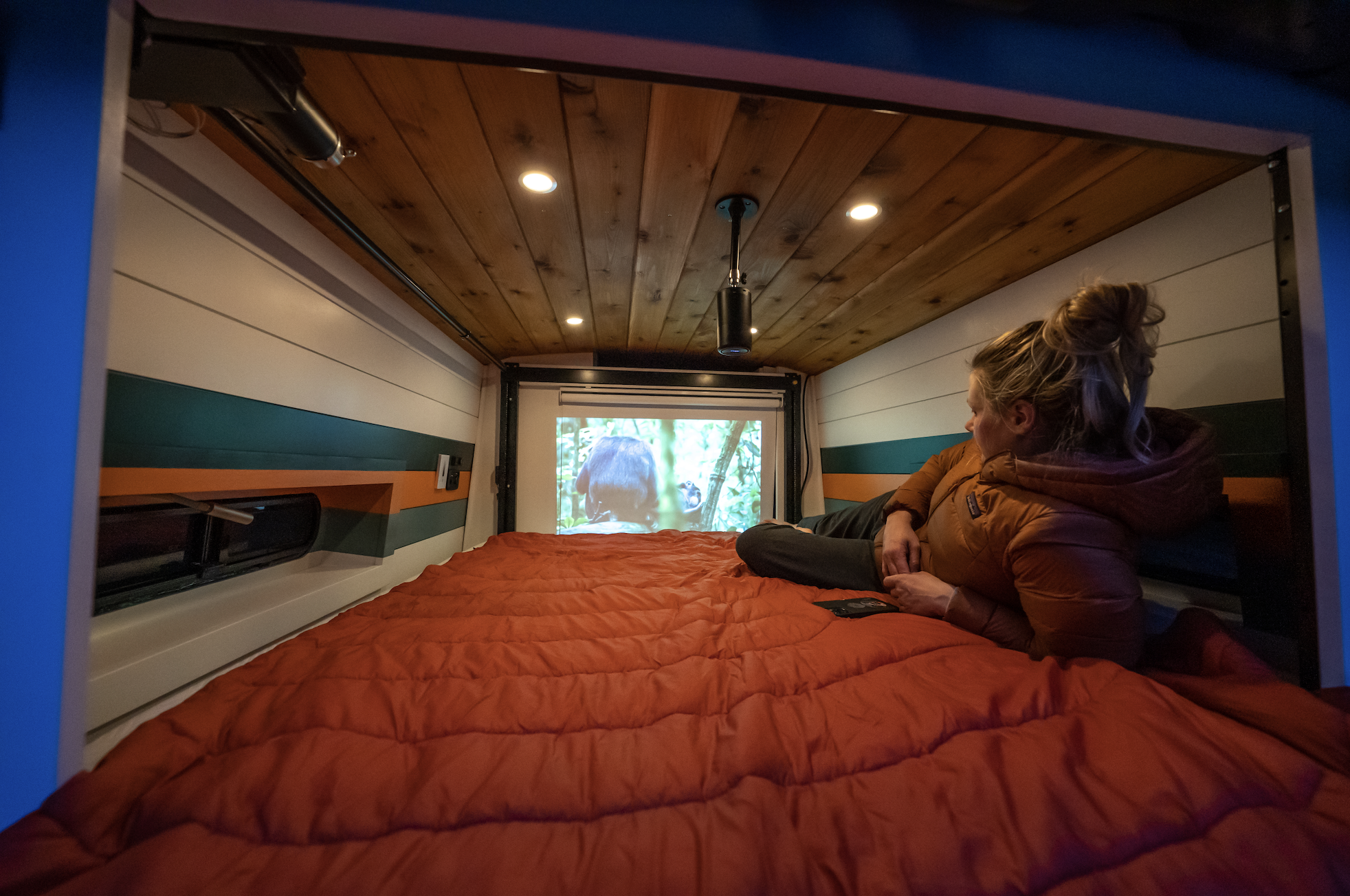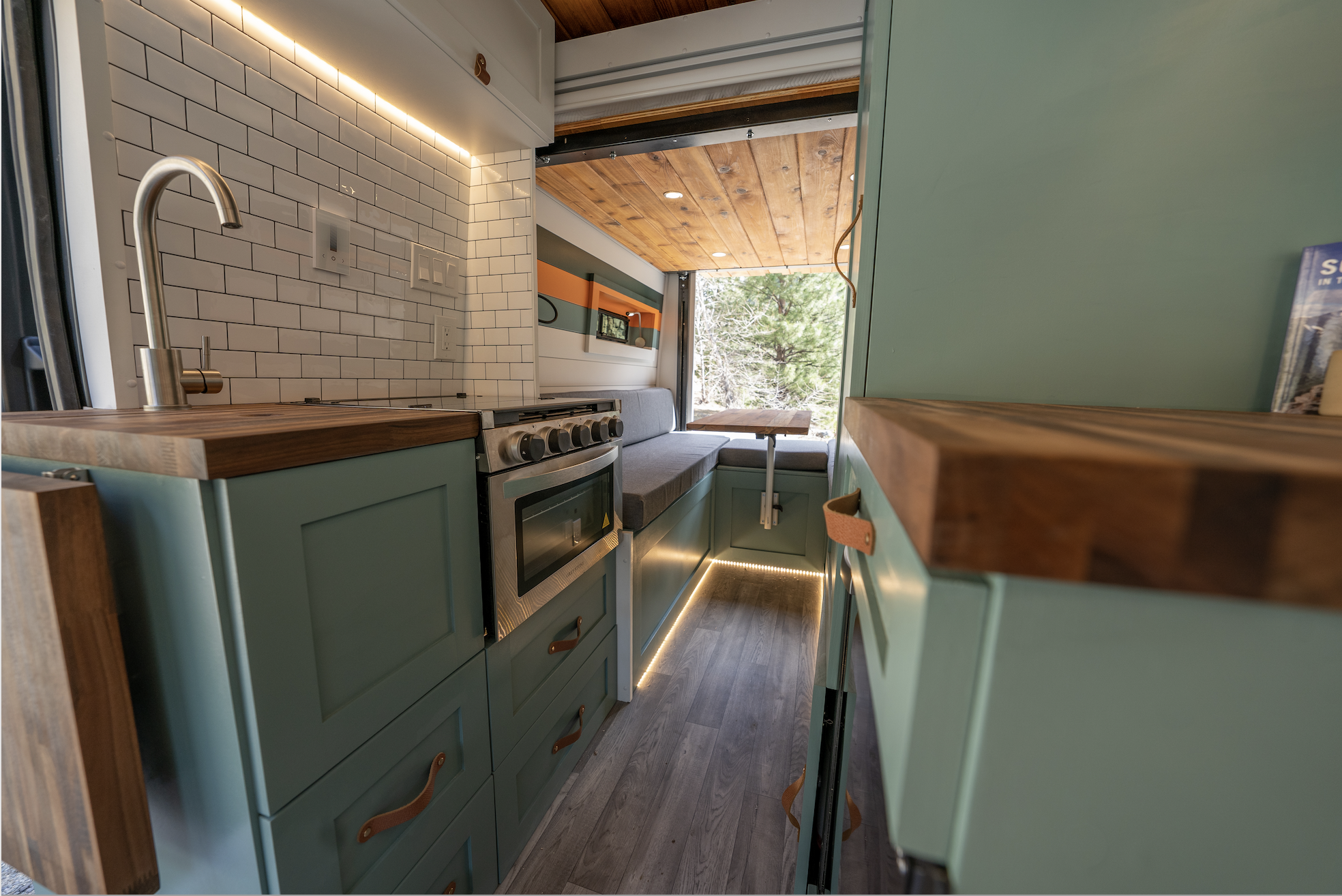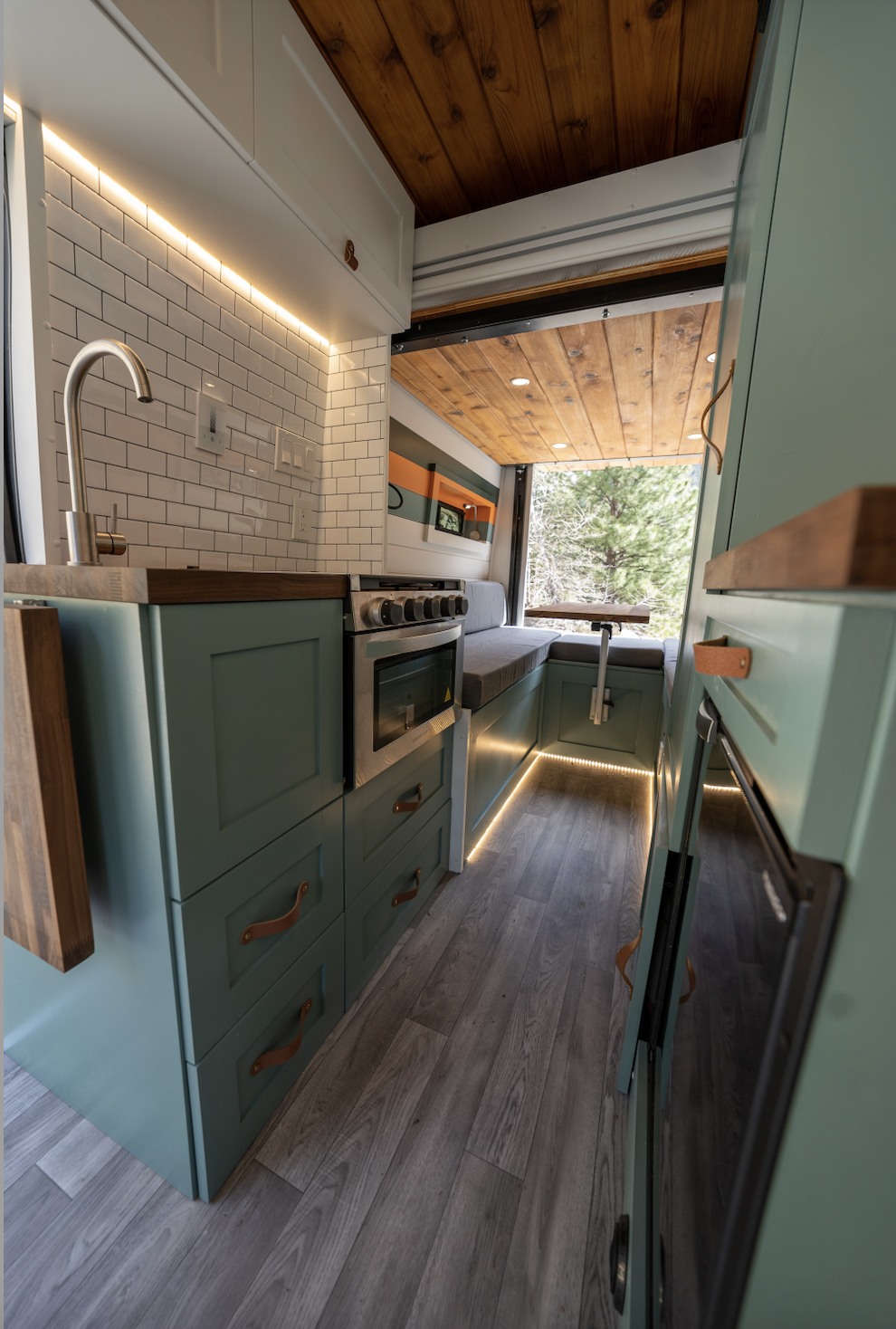 We had so much fun designing a unique ski oriented van, that looked great, but still maintain functionality at it’s core. The ability to work and hang out in the back of the van with the heater pumping, while someone else is cooking is a great way to maximize a small space. With the push of a button their bedding, mattress, and pillows come down from the ceiling to create a comfortable and easy to use sleeping area.