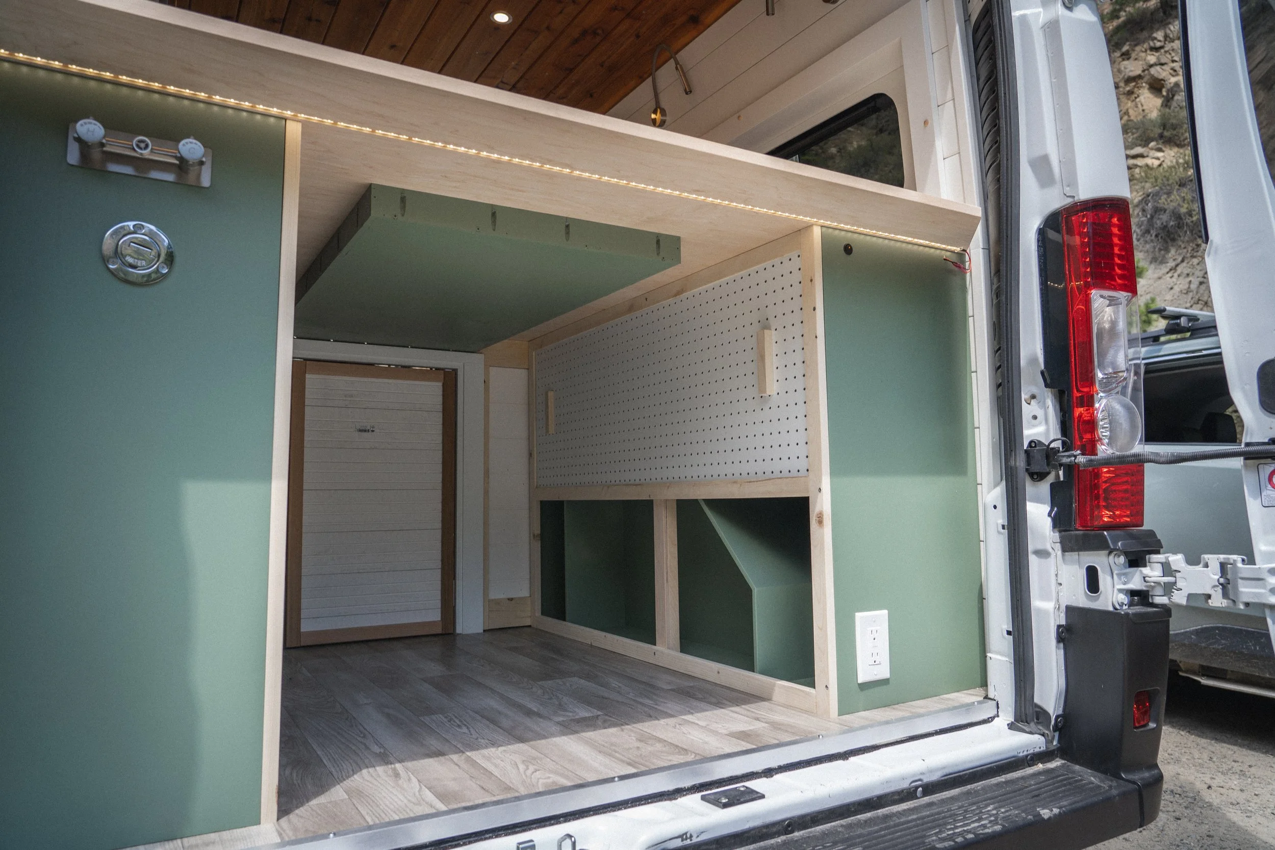 The build maximes storage and livability - after completing quiet a few U-shaped designs we continued to get requests for a garage style build. So we were excited to create something with the finest components on the market, maximizes storage, while still maintaining a relatively large dinign/living area. This van is plug and play and ready to go.