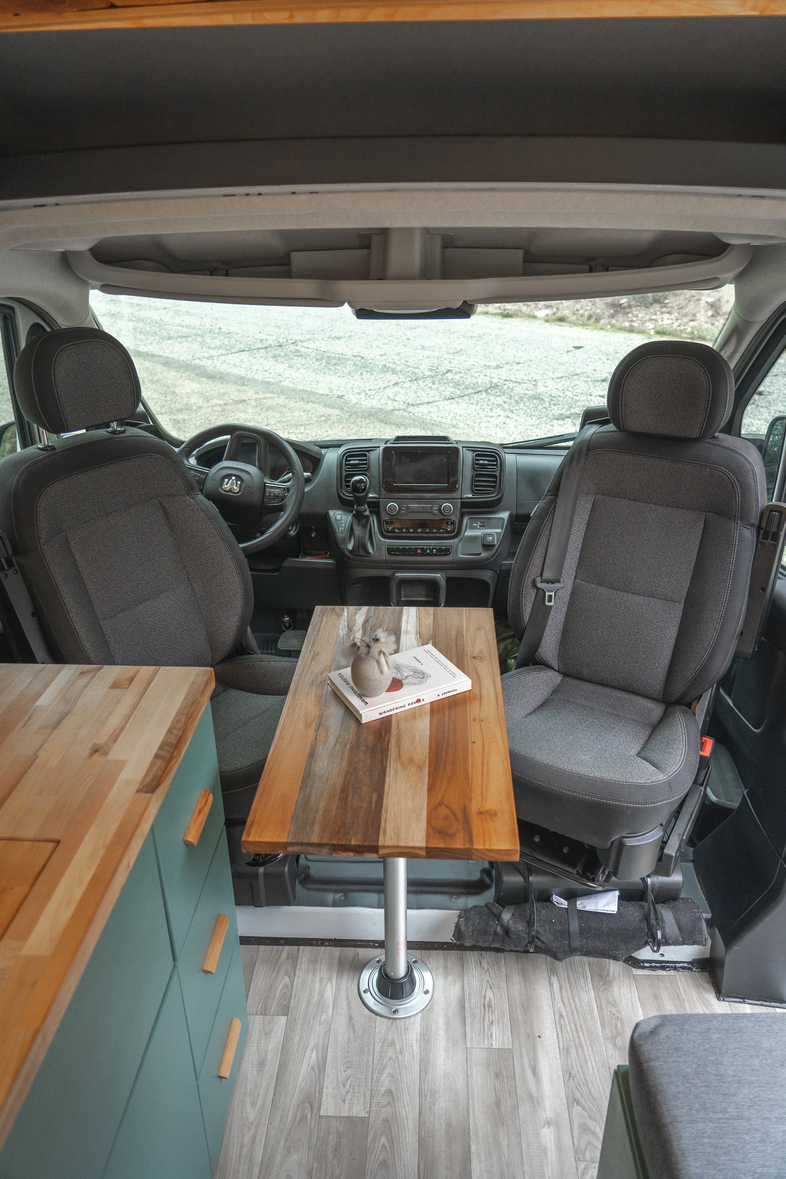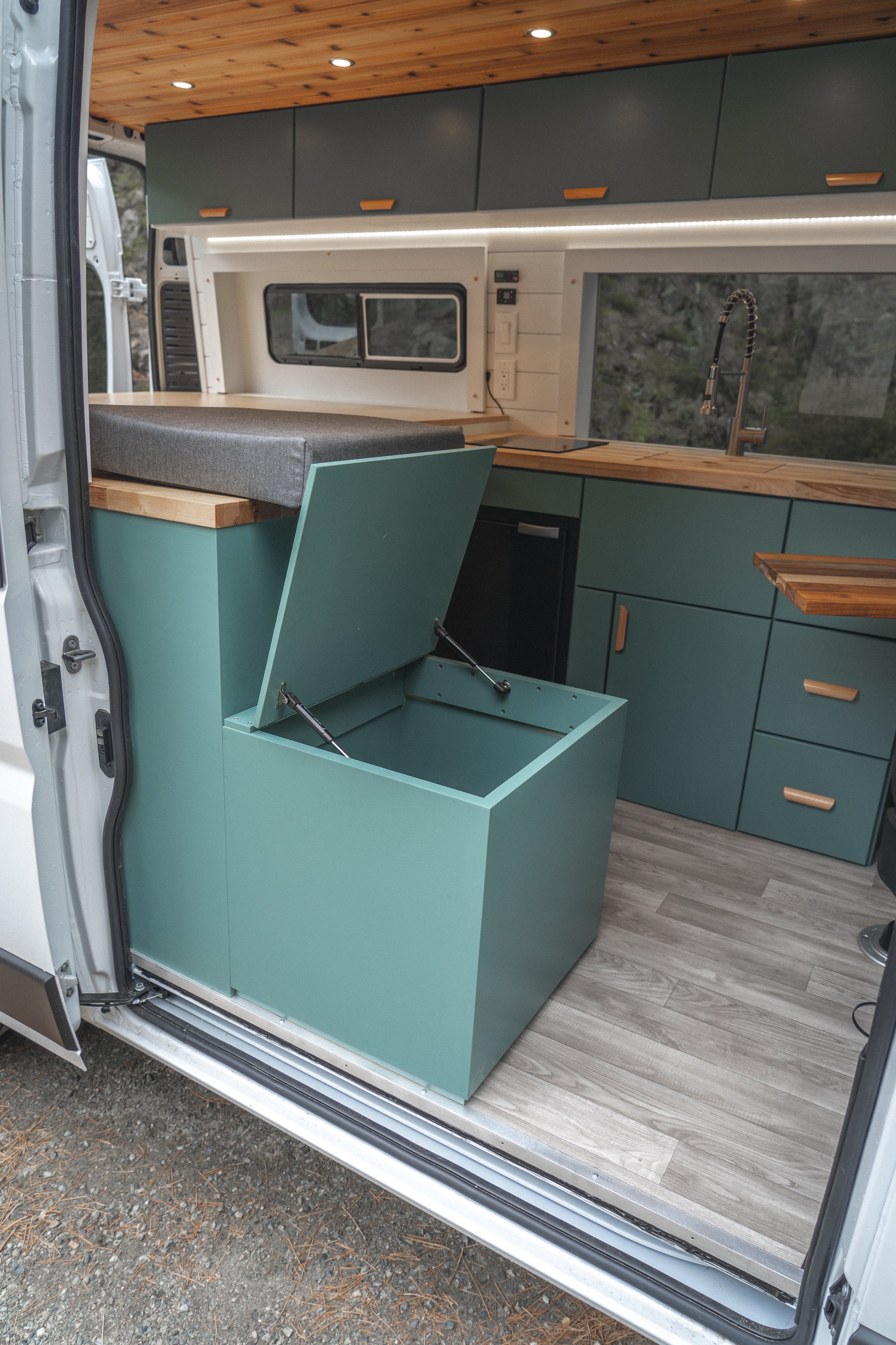 Featuring a garage style build, this build allows you to bring all of the toys with you wherever you go. We brought the bed platform all the way to the window cubbies to allow for side sleeping, as well as front/back sleeping. By utilizing the front swivel seats as the main dining/work area we were able to still provide a full kitchen, a large storage drawer for shoes by the entrance, and extra storage space. With a made in Italy yacht fridge, German engineered hot water/heater system, and a full Victron battery/electrical system (except the 2000w Renogy inverter) this van features top of the line components that have proven to last.